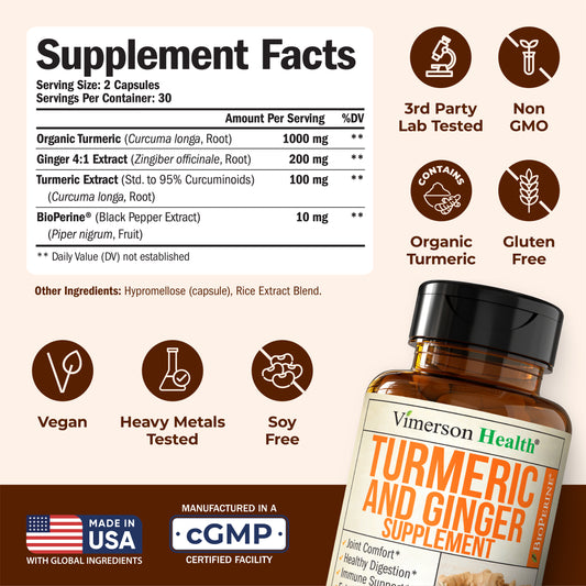 Turmeric Curcumin Supplement with Ginger Root for Joint Support, Digestive & Gut Health - Contains Organic Turmeric Curcumin with Black Pepper (Bioperine) for Enhanced Absorption - 60 Capsules