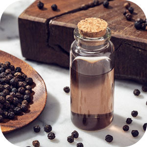 Black pepper essential oil is extracted from the dried and crushed peppercorns. It is highly concentrated and potent, containing the characteristic spicy aroma of black pepper. It is used in aromatherapy and skincare products.