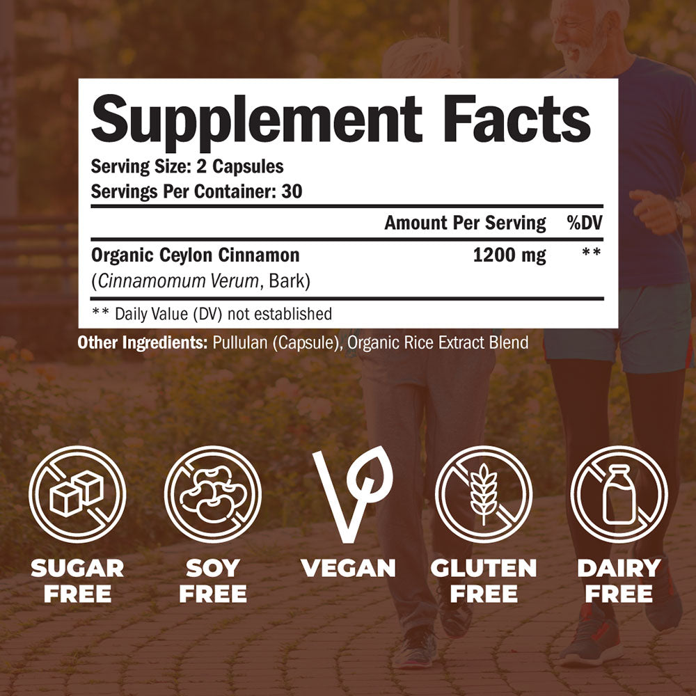 - Organic Ceylon Cinnamon (Cinnamomum verum)(bark) 1200mg.