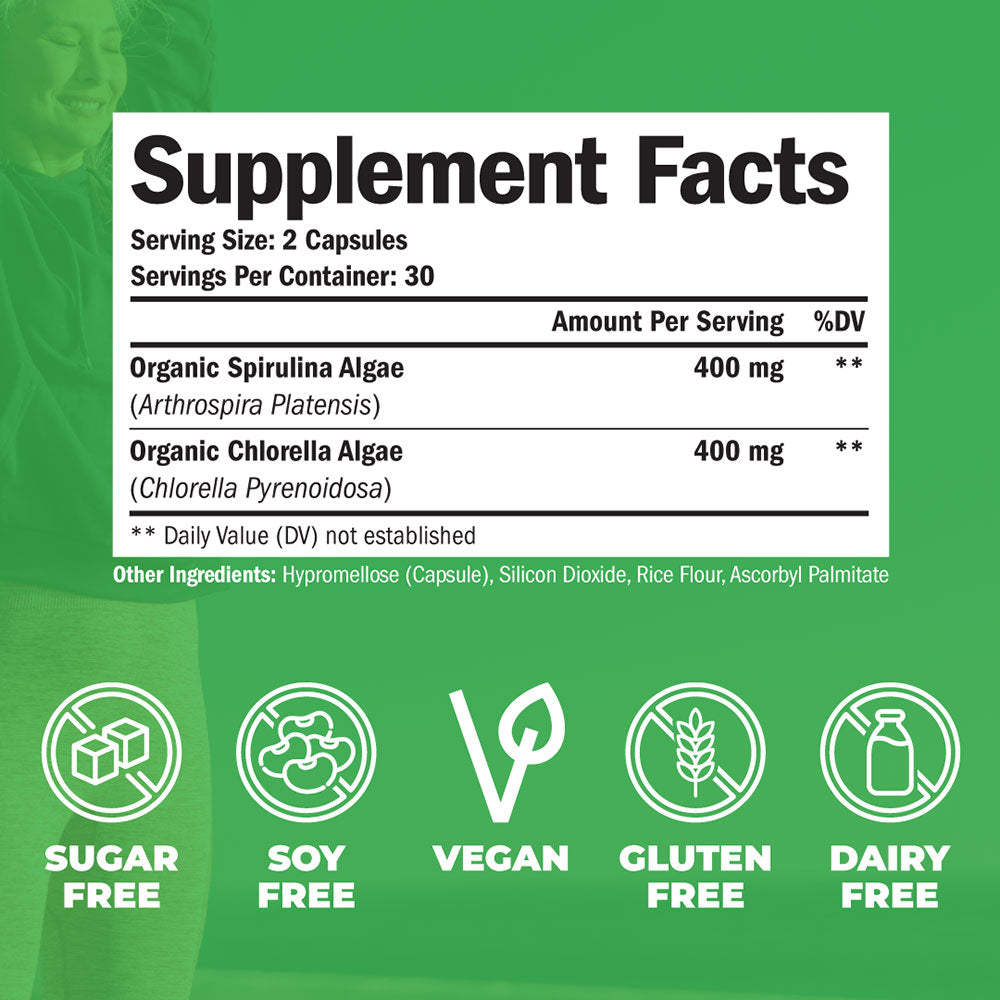Often, you'll find chlorella and spirulina tablets separated in two different supplements. Our combination ensures you're reaping the benefits of taking spirulina while also harnessing chlorella's detoxifying prowess.