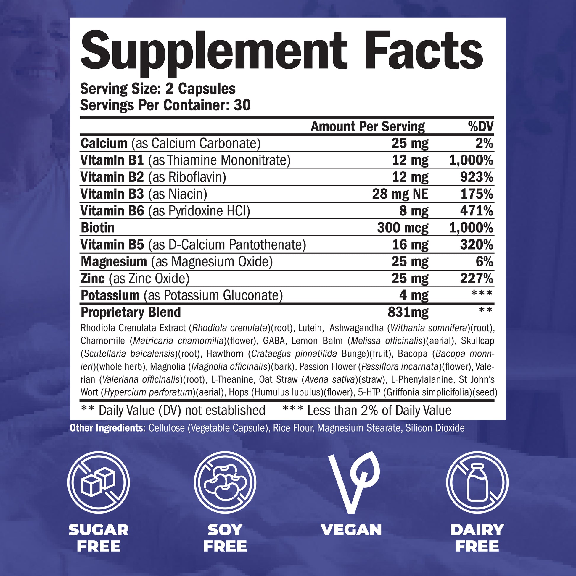 - Proprietary Blend: (Rhodiola Ext Sal 1% HPLC, Lutein 5%, Ashwagandha, Chamomile, Gaba, Lemon Balm, Skullcap, Hawthorn, Bacopa (Brahmi), Magnolia, Passion Flower, Valerian, L-Theanine, Oat Straw (Avena Sativa) 20:1, Mucuna Pruriens 14% HPLC, St. John's Wort, Hops, Griffonia Seed Ext 5-HTP) 830mg